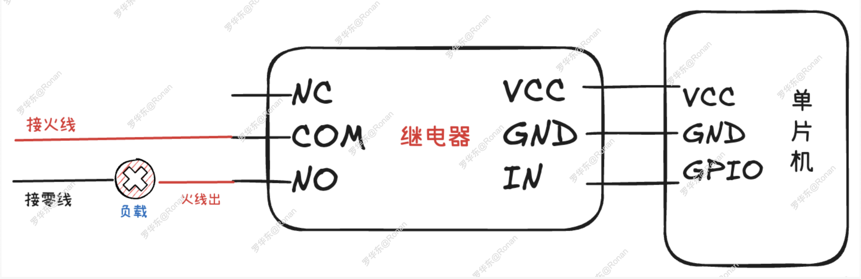 - 当IN端给 低电平,NO端断,NC端合,负载即停止工作