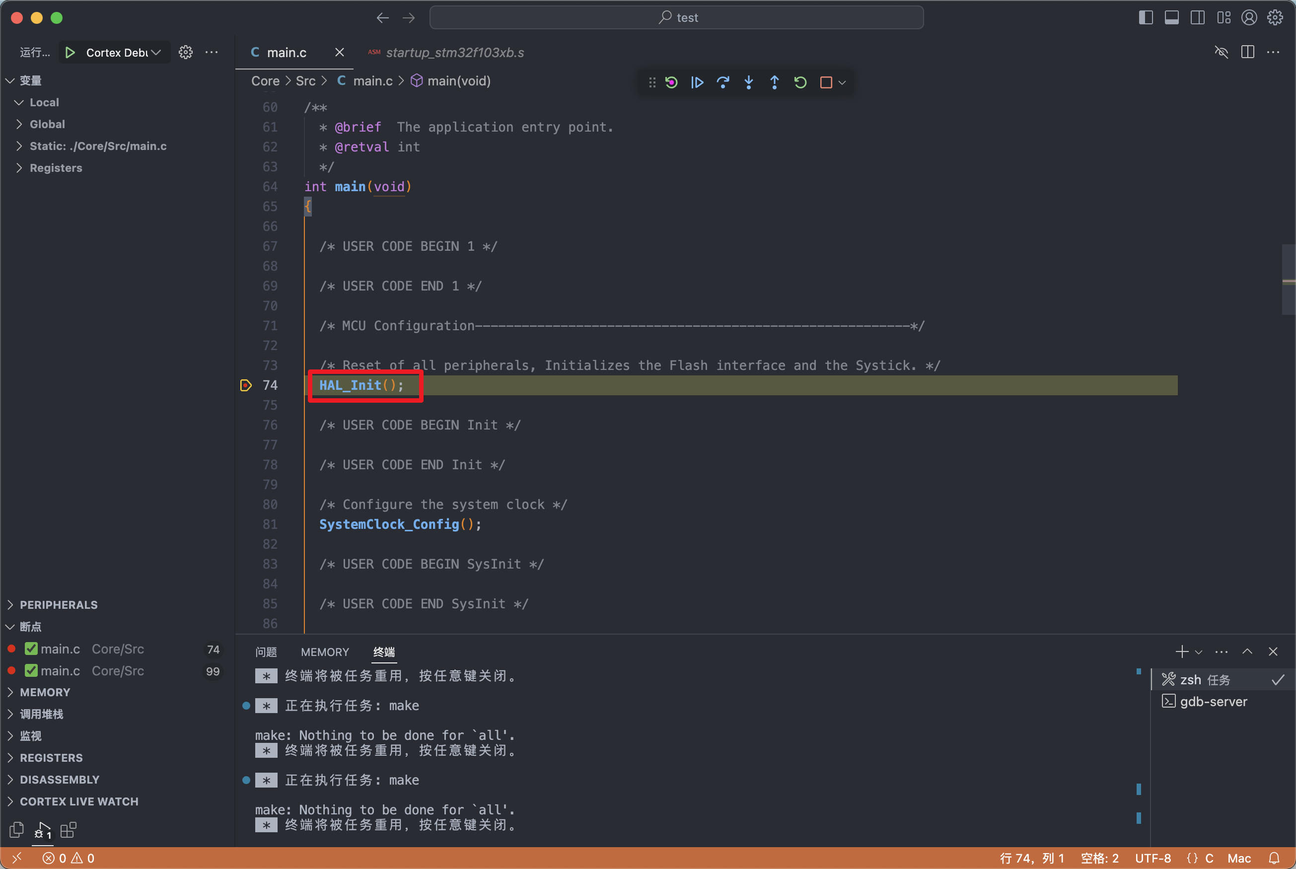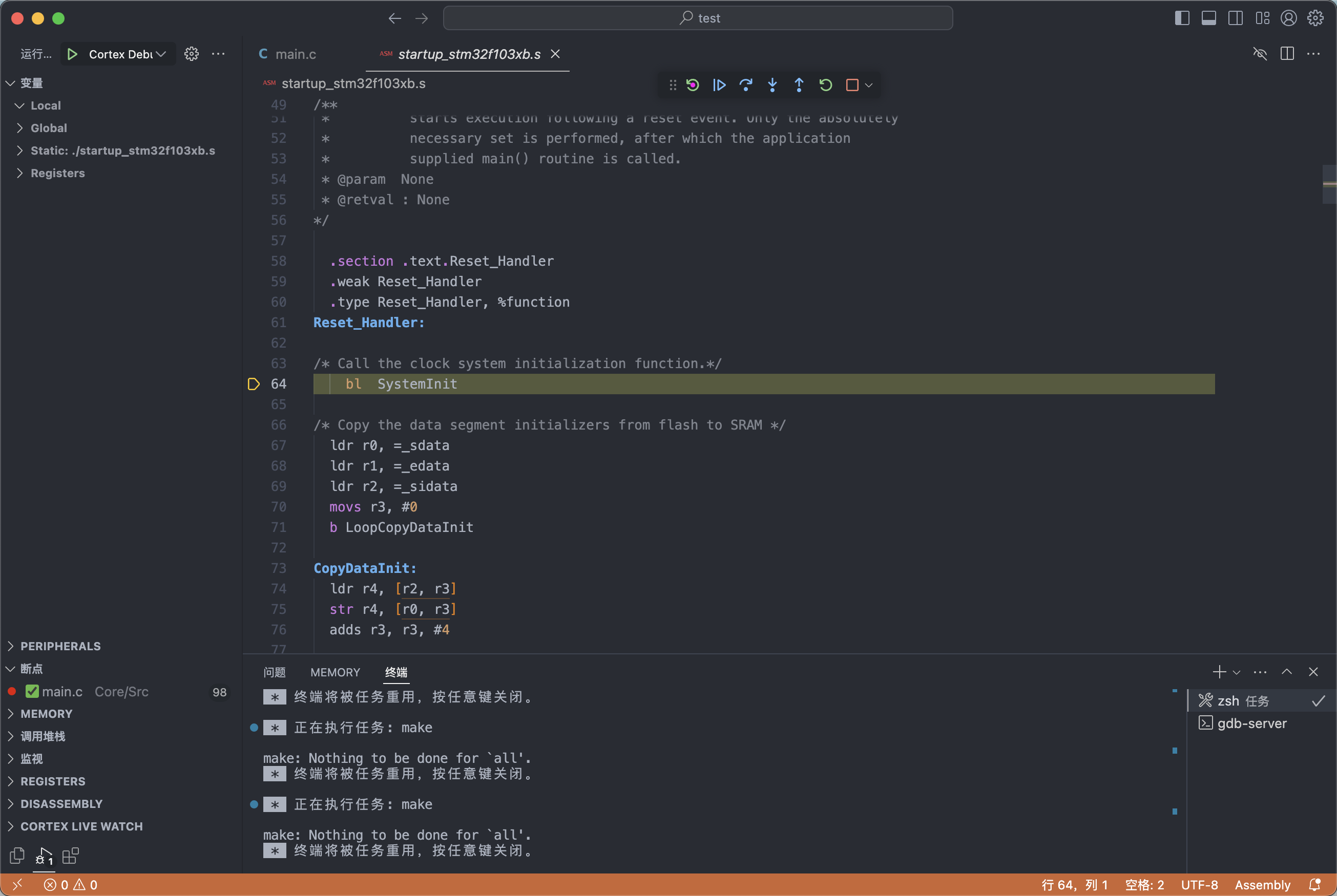 openocd -f interface/stlink-v2.cfg -f target/stm32f1x.cfg2.保持上面的终端不要退出,然后开启一个新的终端窗口,输入命令「arm-none-eabi-gdb -q path/build/<your_project>.elf」 就可以进入 gdb 调试:
