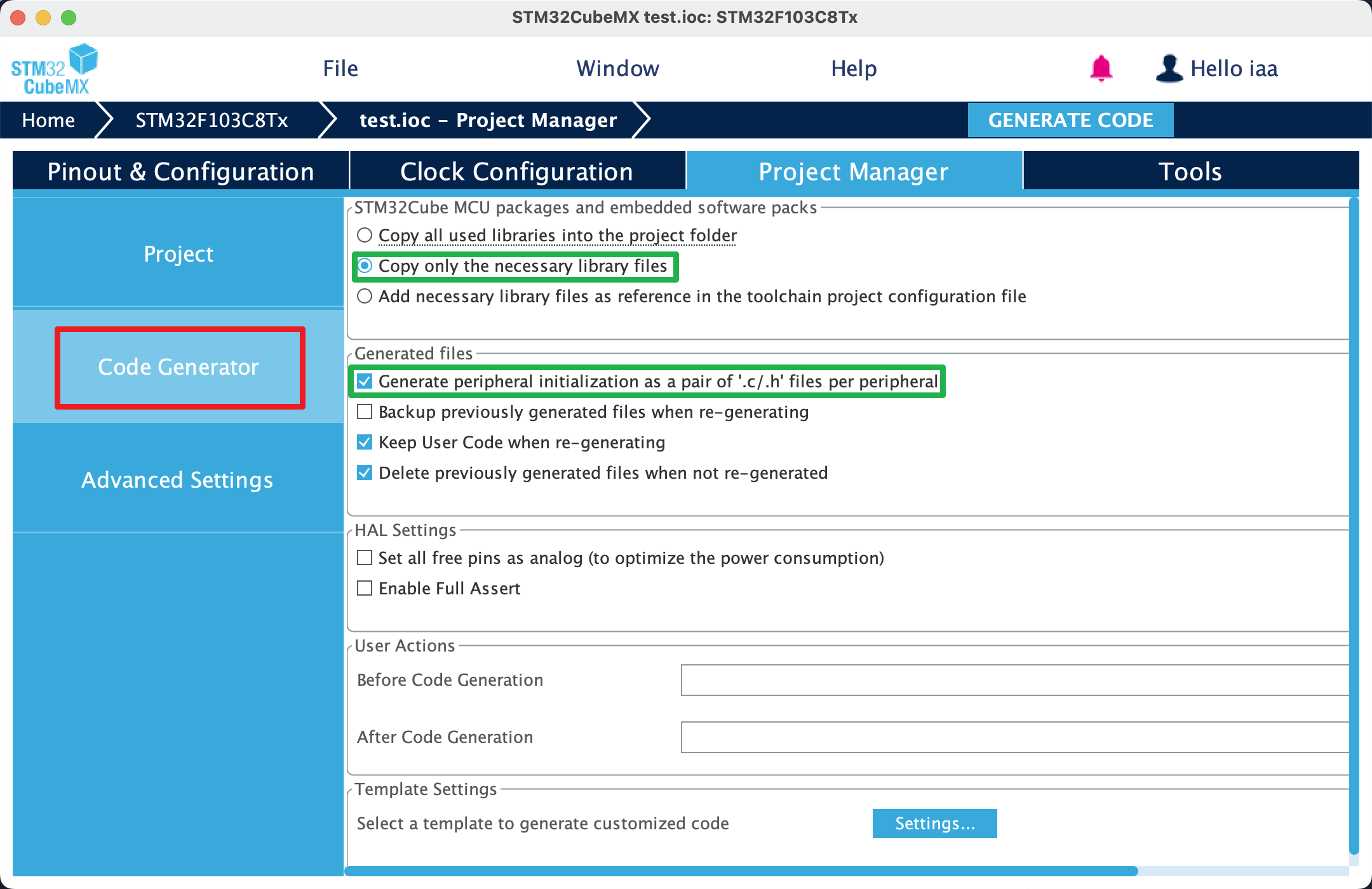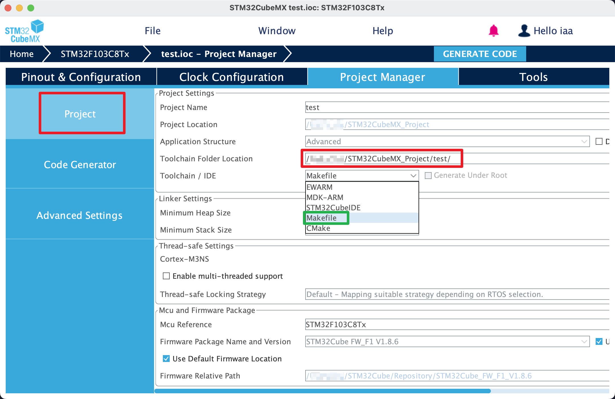 2.在 STM32CubeMX 配置好工程,点击左侧选项卡,然后勾选绿色框里的选项选择 Makefile 导出: