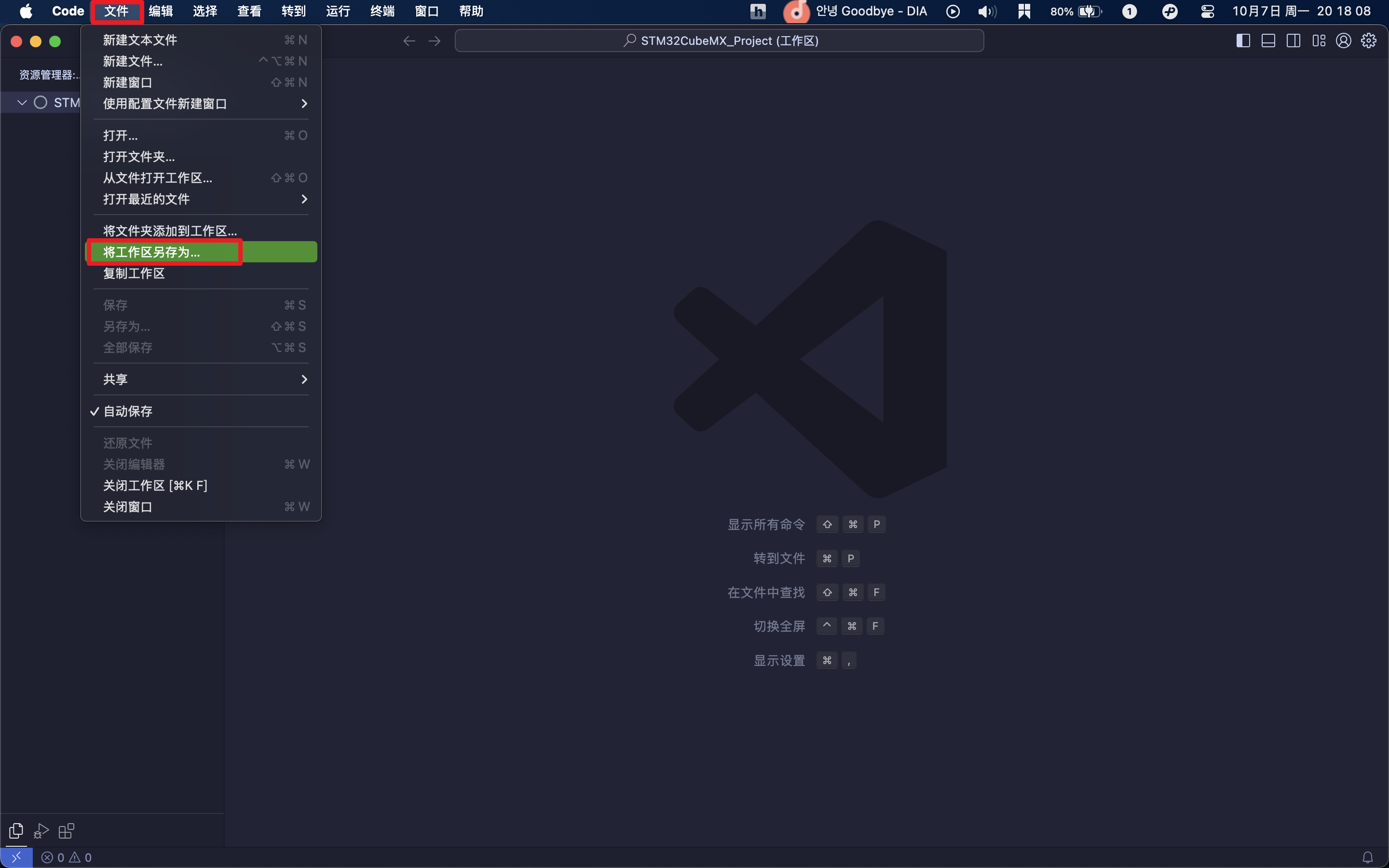 1.新建一个 STM32CubeMX_projects 目录(以后的工程就统一放置在该目录下,建议不要放置在桌面,放在自己容易记忆的位置),然后使用 vscode 打开该目录,并且将其保存为工作区,将工作区文件保存在希望的位置,以后可以通过双击该文件直接打开 STM32CubeMX_projects 工作区: